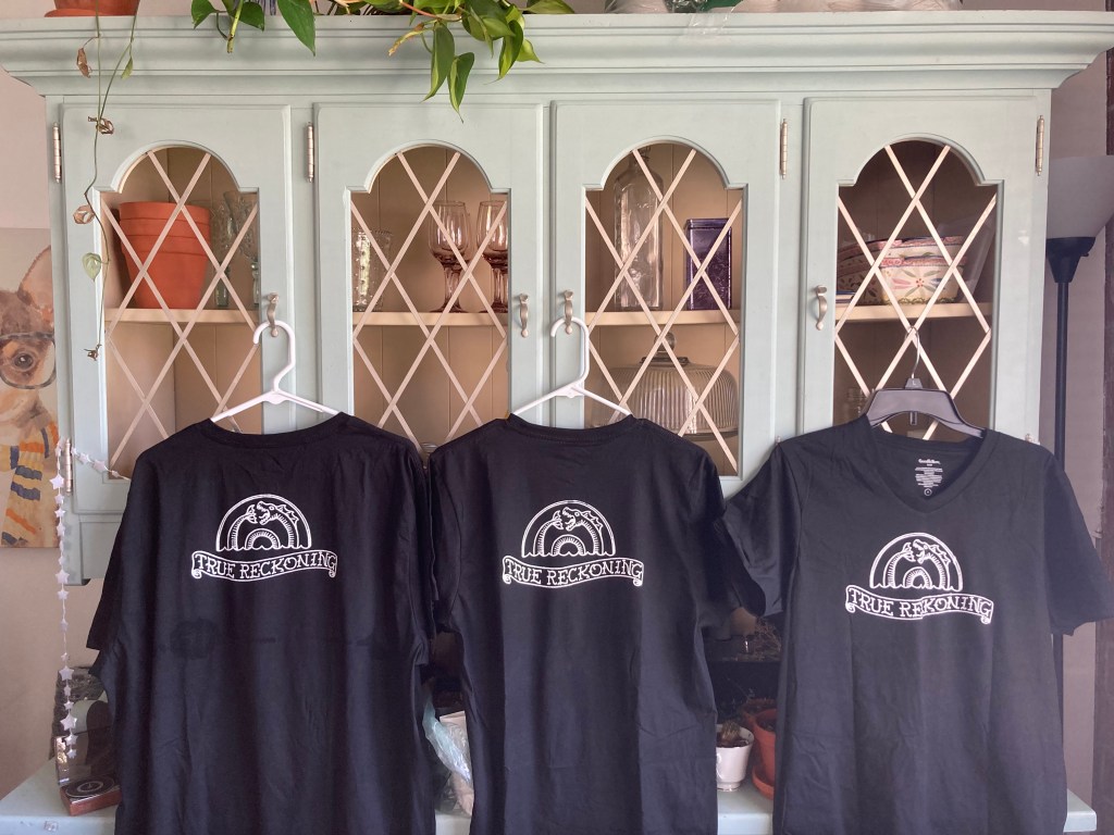Sport your very own handmade True Reckoning merch! To order, complete the contact form below with your shipping address and the sizes of shirts you’d like. Then, Venmo our band @truereckoning any amount at or above the minimum donation of $30.00.